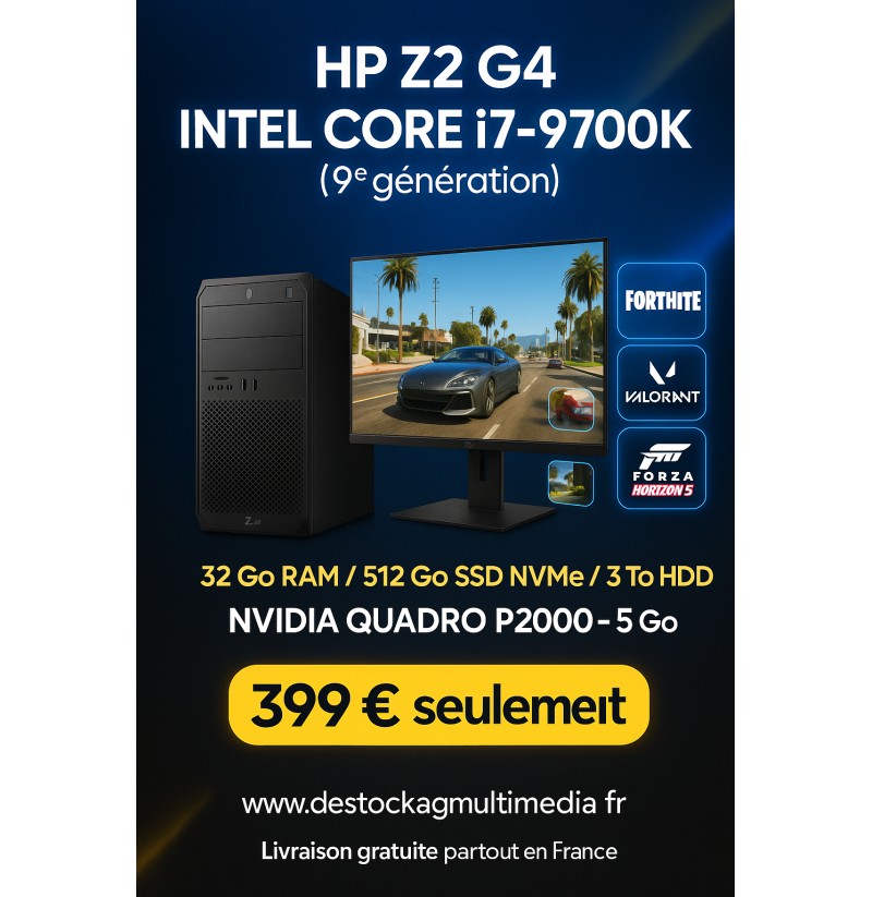 HP Z2 G4 Core i7 9700K 32 Go 512 Go 3TB HDD Quadro P2000 Wifi Windows 11 Professional